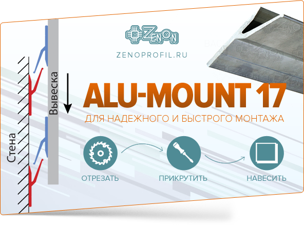 Компания Зенон представляет Вашему вниманию алюминиевый профиль для надежного и быстрого монтажа настенных вывесок и световых коробов - ALU-MOUNT 17. Профессионалы своего дела уже оценили простоту и удобство использования этого профиля для задач монтажа наружной рекламы!