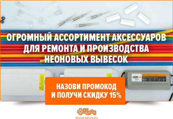 У нас вы найдете большой ассортимент комплектующих для производства и ремонта неоновых вывесок, огромный выбор аксессуаров для монтажа, изоляции, запуска и проверки неоновых вывесок.