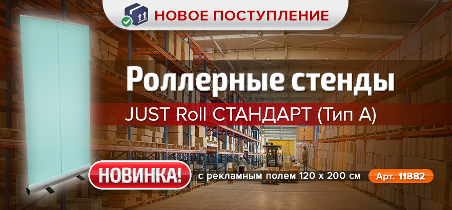 У JusT Roll СТАНДАРТ (тип А) имеются боковые пластиковые опоры и одна ножка посредине основания или две ножки (для стендов 100 см, 120 и 150 см), что придает стенду большую устойчивость.