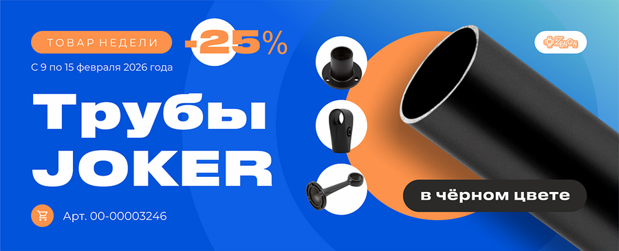 С 9 по 15 февраля 2026 года в рамках акции «Товар недели» во всех филиалах компании ЗЕНОН будет действовать скидка 25% на трубы JOKER в чёрном цвете (арт. 00-00003246).