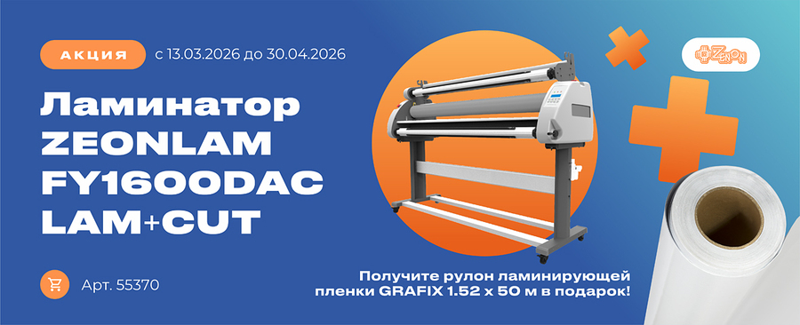 Сообщаем о старте новой акции на рулонные ламинаторы! До конца апреля приобретайте ламинатор ZEONLAM FY1600DAC LAM+CUT и получайте рулон ламинирующей пленки GRAFIX 1.52 x 50 м в подарок.