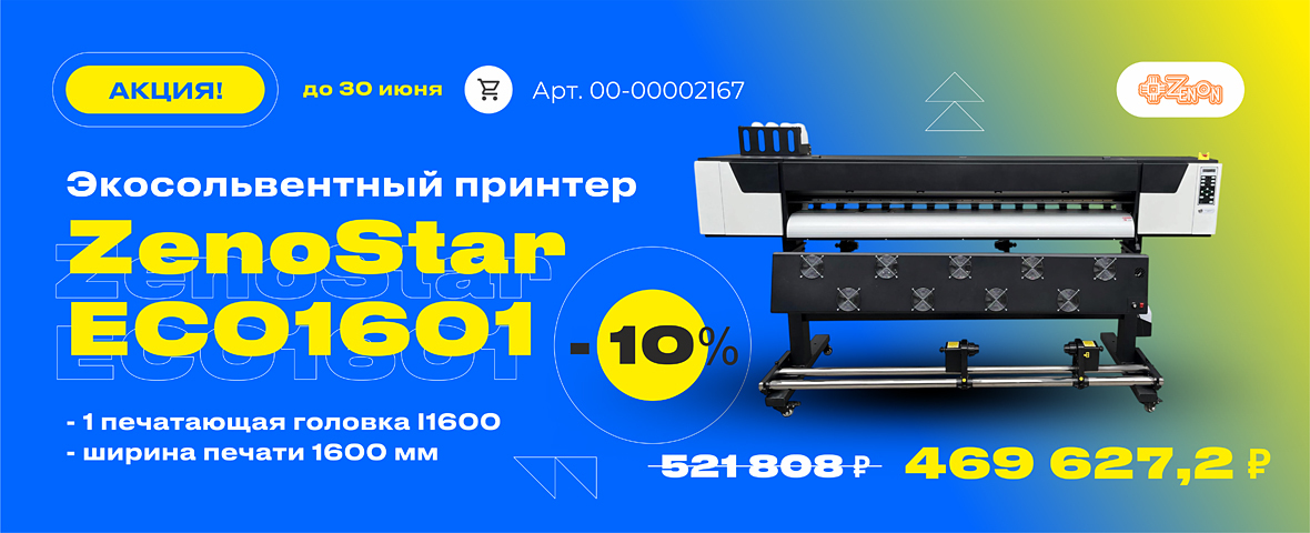 До 30 июня включительно компания ЗЕНОН предоставляет скидку 10% на экосольвентный принтер ZenoStar ECO1601 (арт. 00-00002167) — надёжного партнёра в сфере широкоформатной интерьерной печати. Оборудование отвечает современным запросам рекламного и полиграфического рынка.