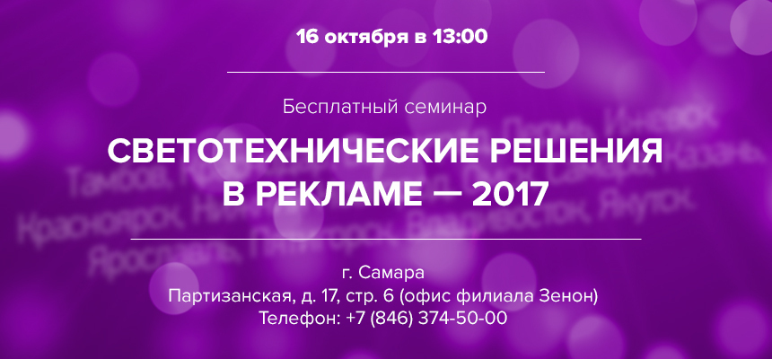 16 октября 2017 года в 13:00 приглашаем вас на семинар «Светотехнические решения в рекламе - 2017», который будет проходить по адресу: г. Самара, ул. Партизанская, д. 17, стр. 6 (офис филиала).