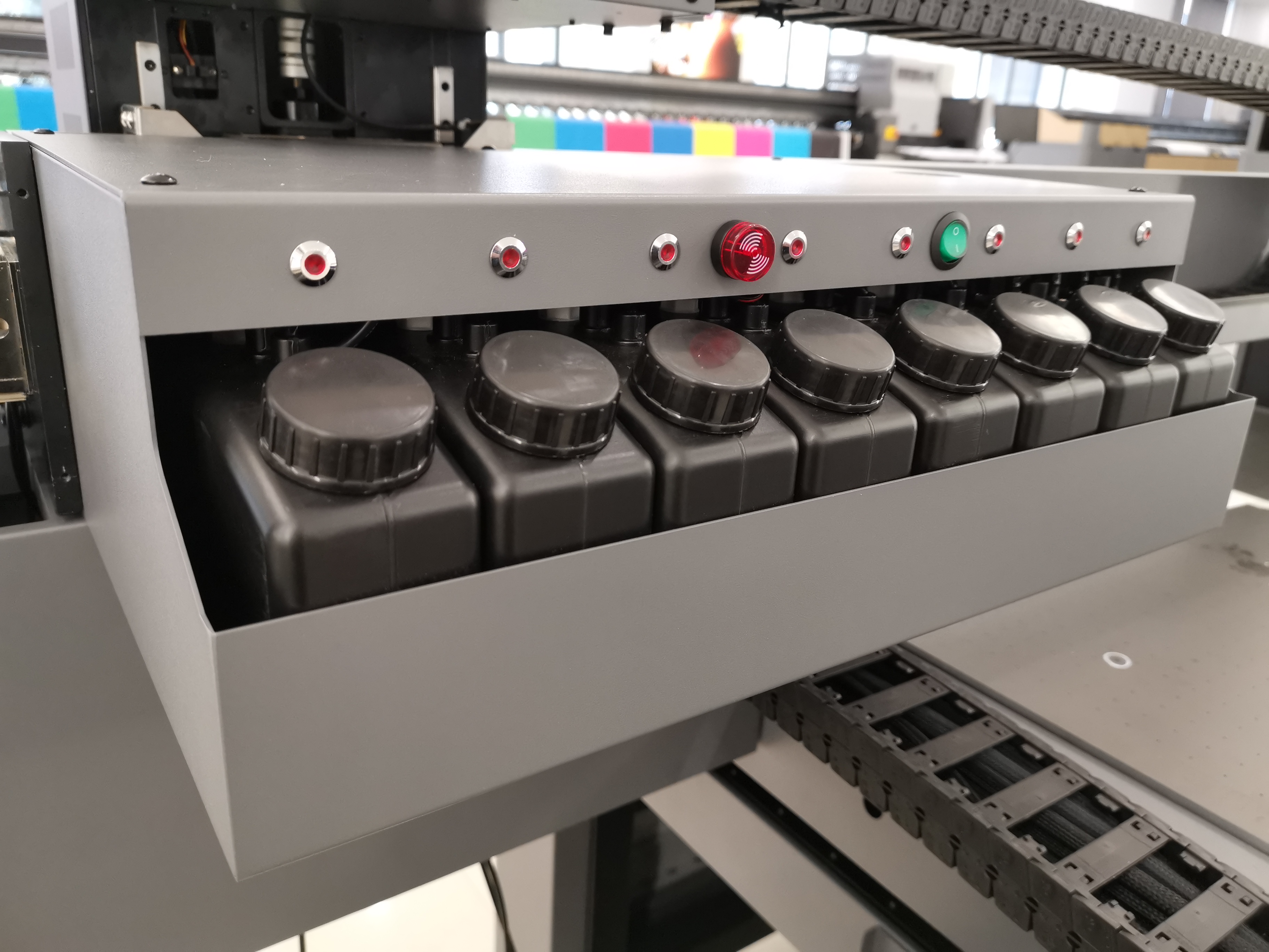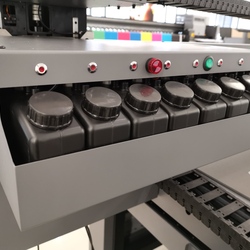 В принтере может быть установлено до трех недорогих печатающих головок EPSON DX11(XP600), с переменной каплей от 3 до 21 пиколитра, что позволяет получать изображения фотографического качества и печатать текст размером вплоть до 2-го пункта включительно. Станок поставляется в конфигурации с 6 цветами CMYKLcLm+W(белый)+V(лак), при этом промежуточные цвета LcLm обеспечивают плавные градиенты и ровные цветовые переходы в полутонах.