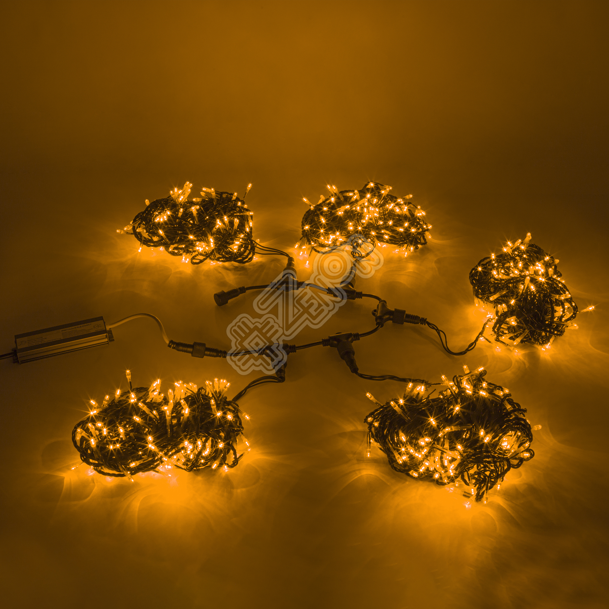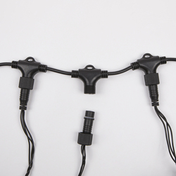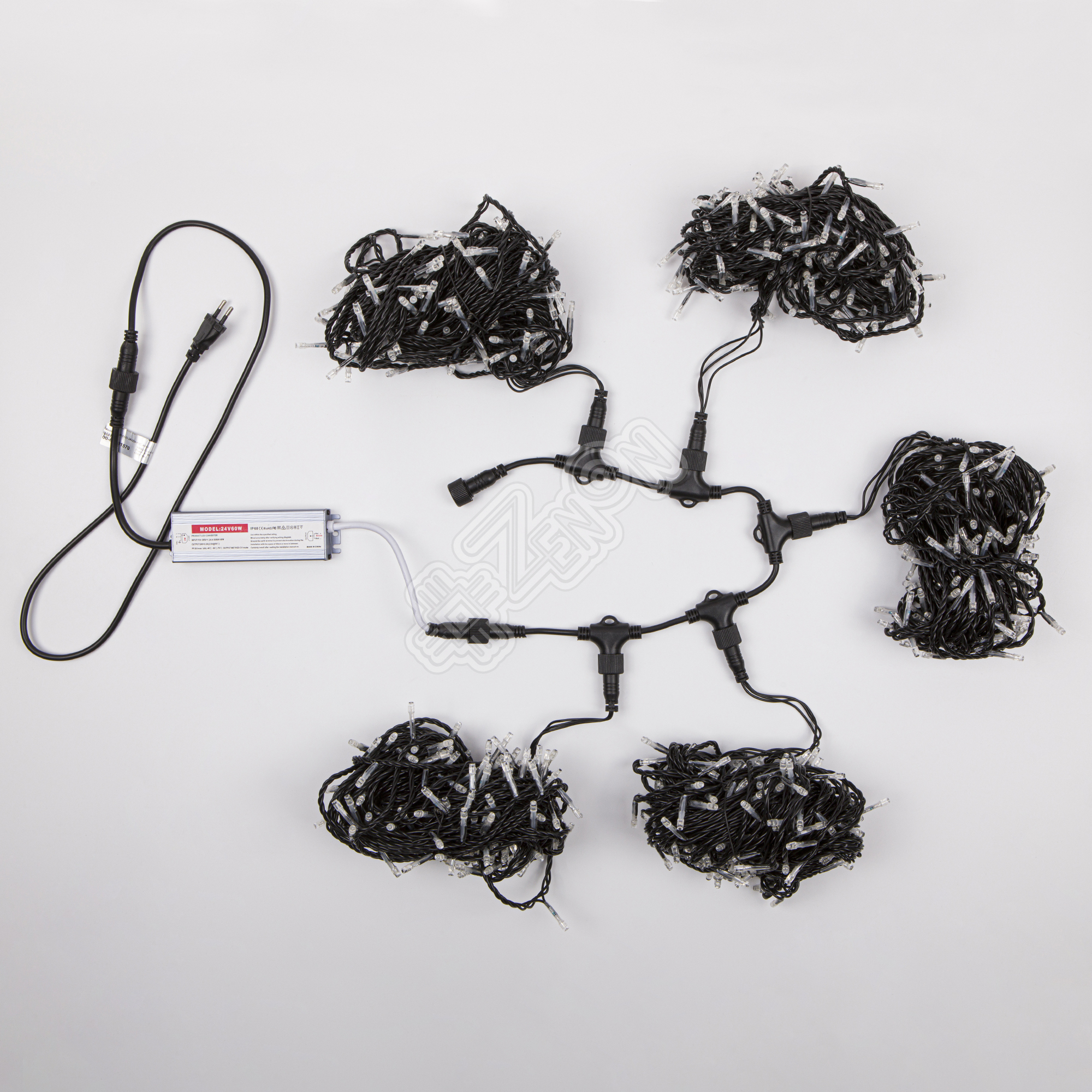 Основной провод- это провод на котором последовательно на расстоянии 100 мм расположены влагозащищенные Т-образные коннекторы, из которых выходит провод со светодиодными лампочками. Поставляется в сборе: шнур подключения к электросети (длина 1 м), блок питания 230В/24В (60 Вт), Т-образные коннектора для подключения 5-ти лучей, 5-ть лучей со светодиодными лампочками (расстояние между светодиодными лампочками на проводе 100 мм).