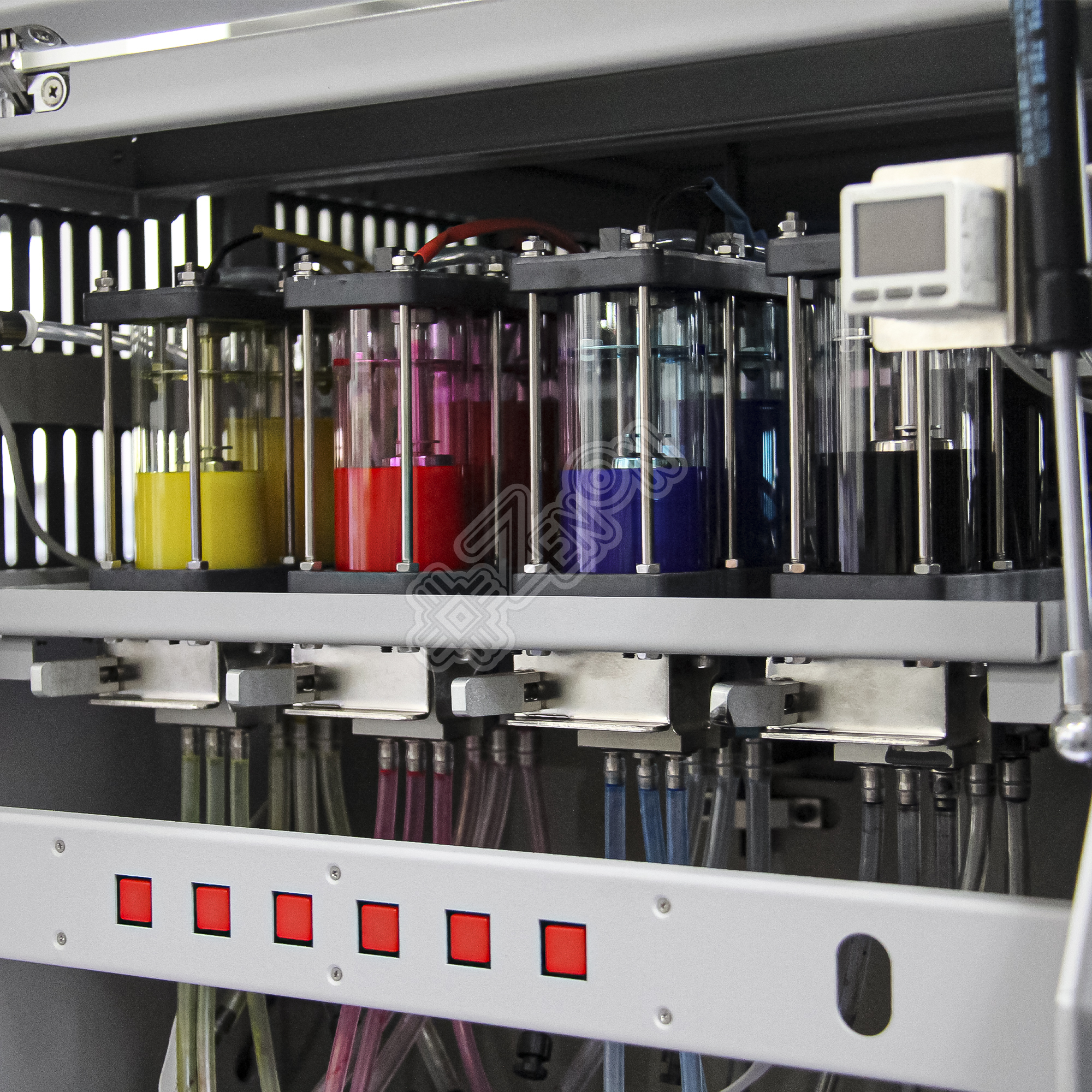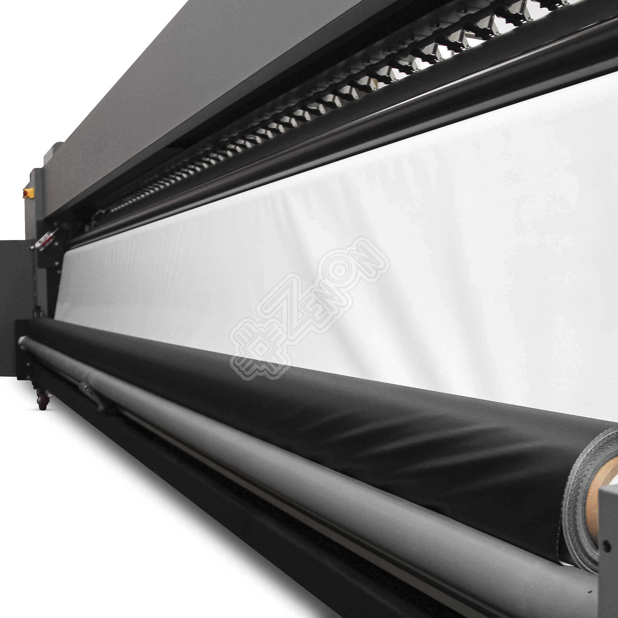 Особого внимания достойна система сушки материала на данной модели: помимо стандартных этапов нагрева и сушки материала (преднагрев, нагрев рабочего стола, постнагрев и ИК-сушка) в комплектации с принтером идет приставная система активной подмотки и ИК-сушки, что позволяет высушить печать на высоких скоростях.