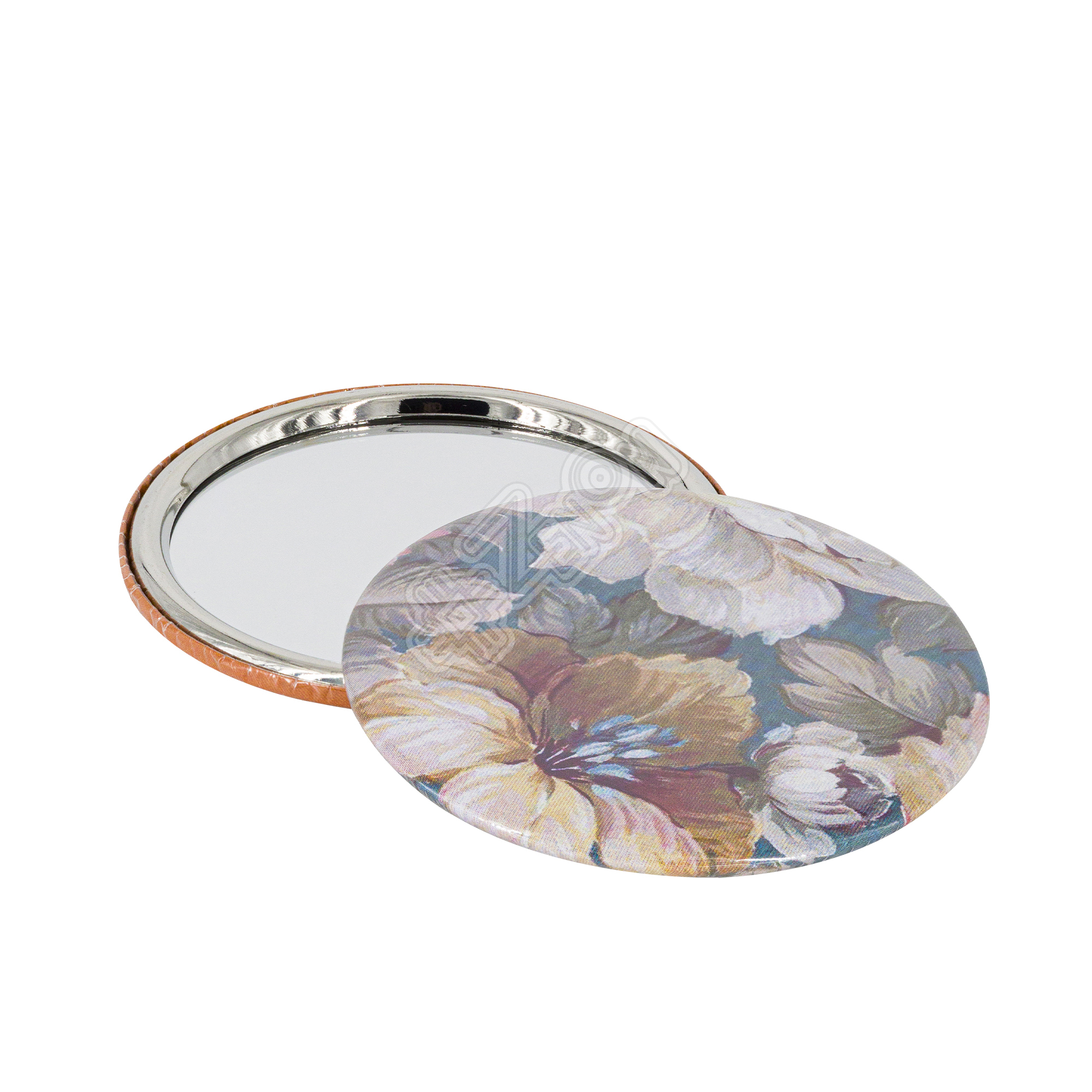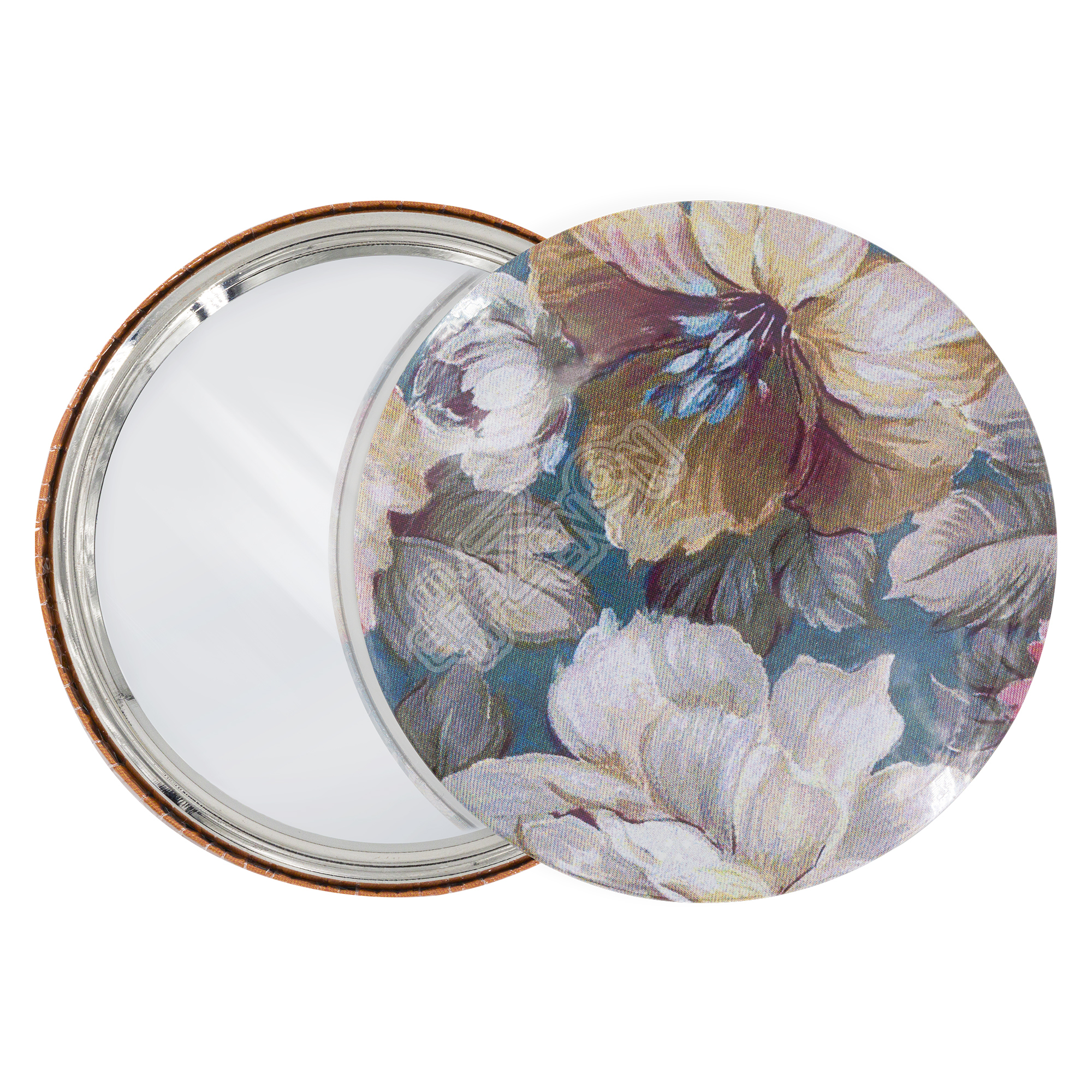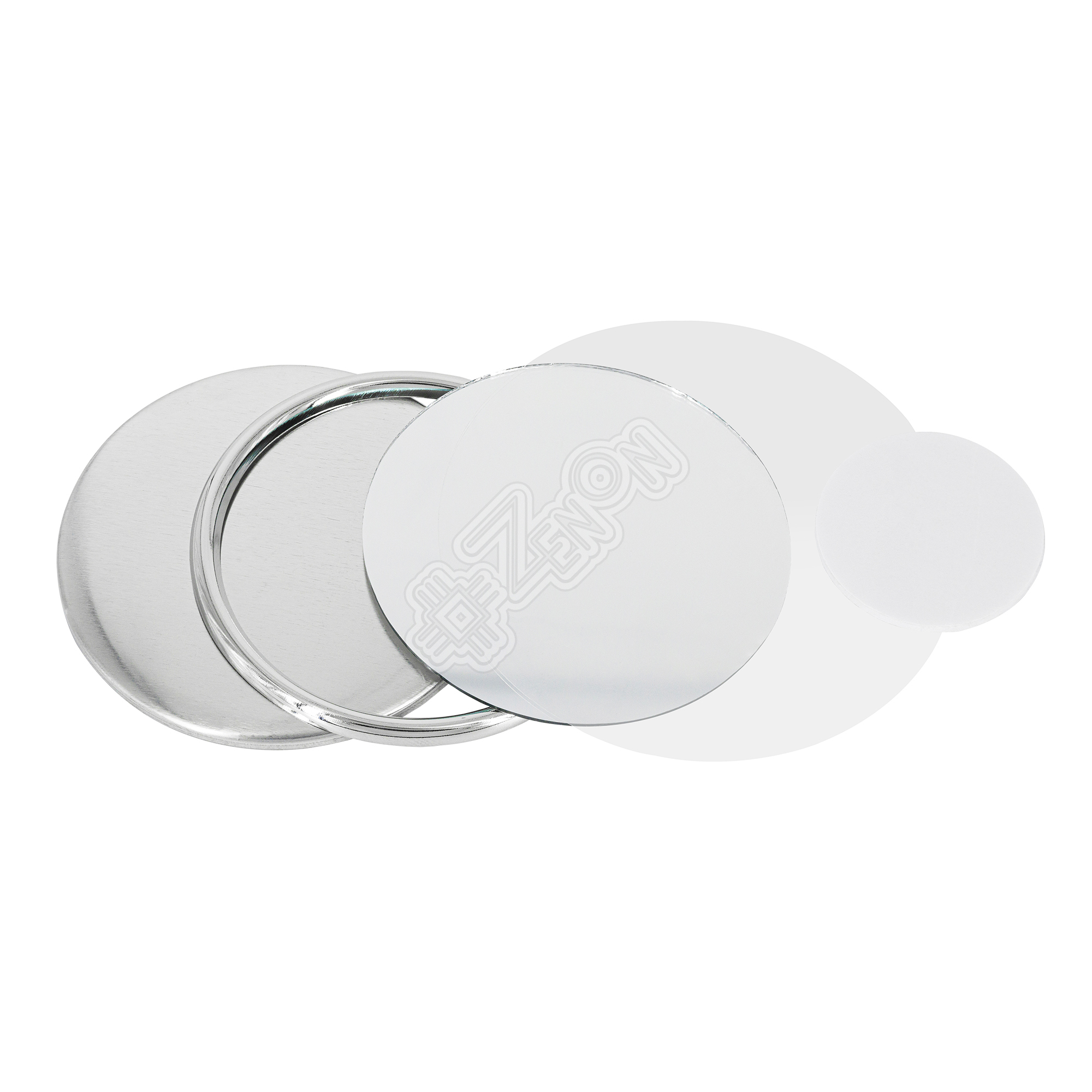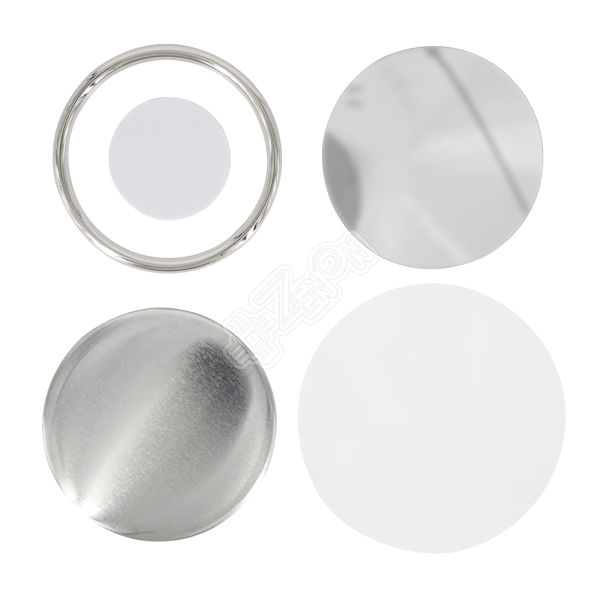 Заготовка закатного зеркала состоит из пяти частей: лавсановая плёнка, задняя крышка (металл), подкладка-спонж, зеркало и фиксирующее кольцо (металл).