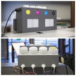 Принтер оснащен системой подключения через интерфейс Ethernet (LAN), что обеспечивает стабильное соединение с любым рабочим компьютером. Заливная СНПЧ (система непрерывной подачи чернил) позволяет минимизировать перерывы на дозаправку, что ускоряет рабочий процесс. Работа с цветовой конфигурацией CMYK и применением экосольвентных чернил делает принтер экологически безопасным. Эко-чернила имеют низкий уровень запаха, что позволяет использовать устройство в закрытых помещениях при соблюдении оптимальных условий: температура 20-25°C и влажность 40-80%. Программное обеспечение Flexi, входящее в комплект, облегчает управление процессами и настройку параметров печати.