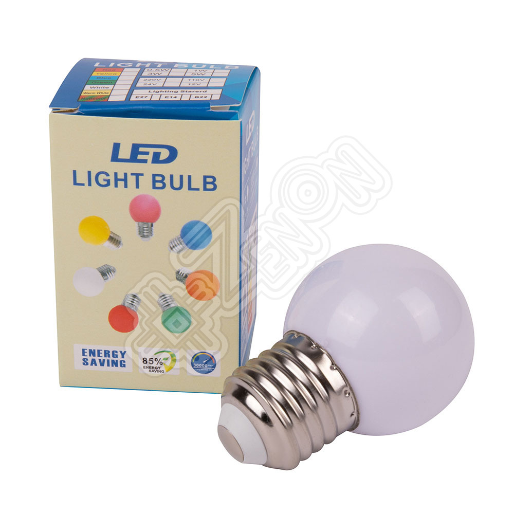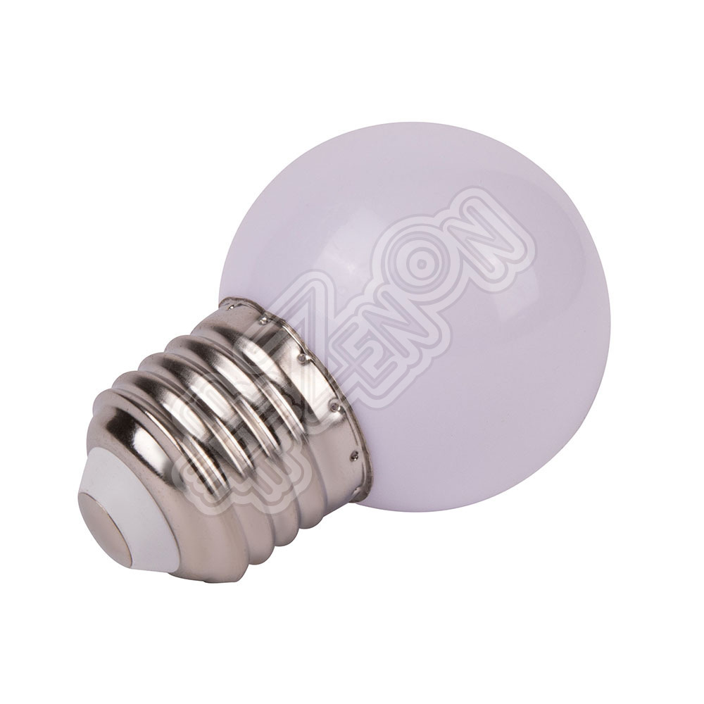 имеет шарообразную колбу G45 выполненную из матового цветного пластика. Цоколь Е27 обеспечивает надежную фиксацию при заручивании в кожух электропатрона. Матовая шарообразная пластиковая колба защищает от внешних воздействий и создает приятное яркое свечение источников света - светодиоды smd 2835 - 4 шт.
