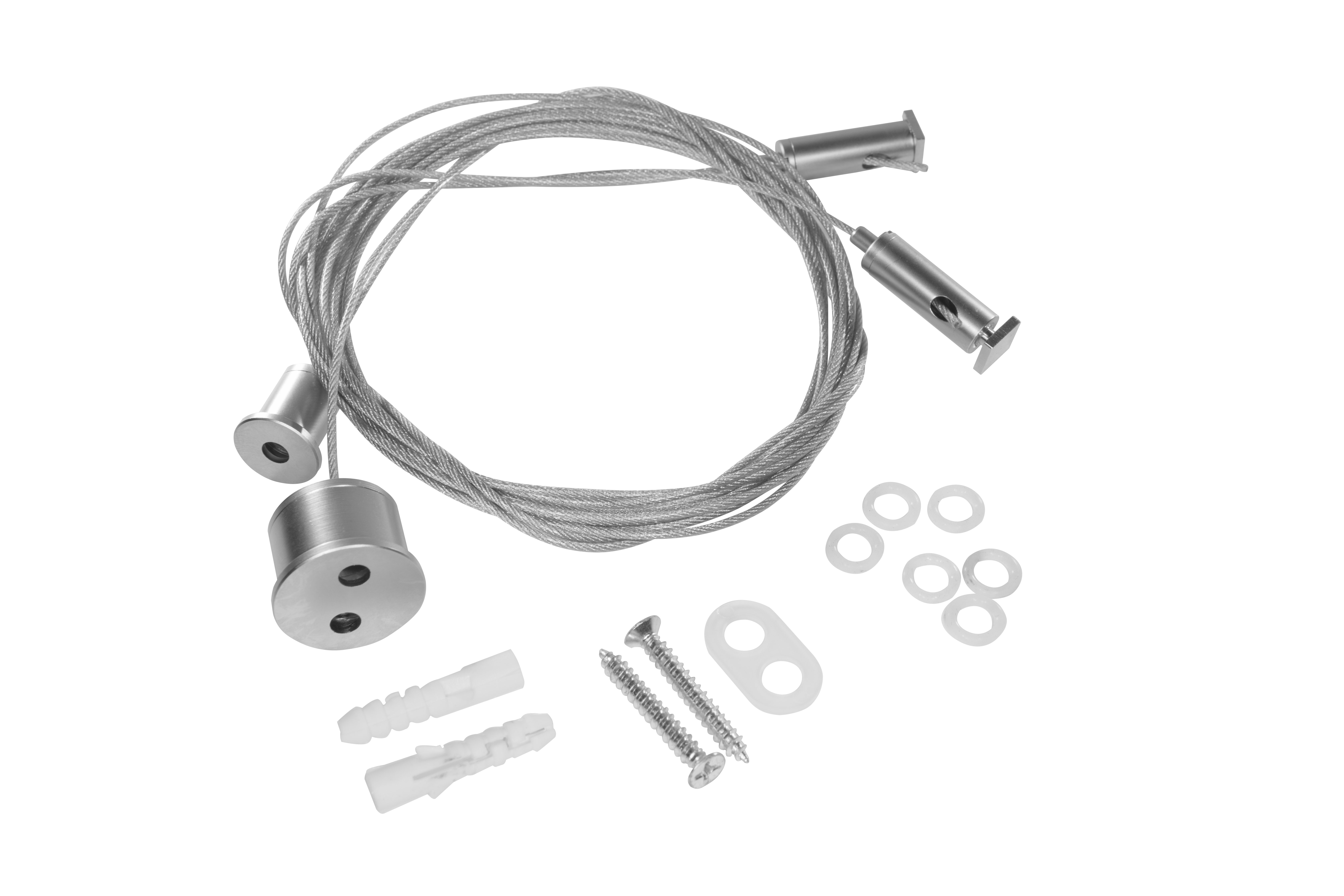 Подвес тросовый для ALU-MINATION, (два крепления к профилю, два крепления к потолку), трос 2+2 м. Данная система изготовлена из высококачественной нержавеющей стали, снабжена механизмом быстрой регулировки длины троса с фиксацией. В комплекте два дюбеля 6х30мм для фиксации подвеса.