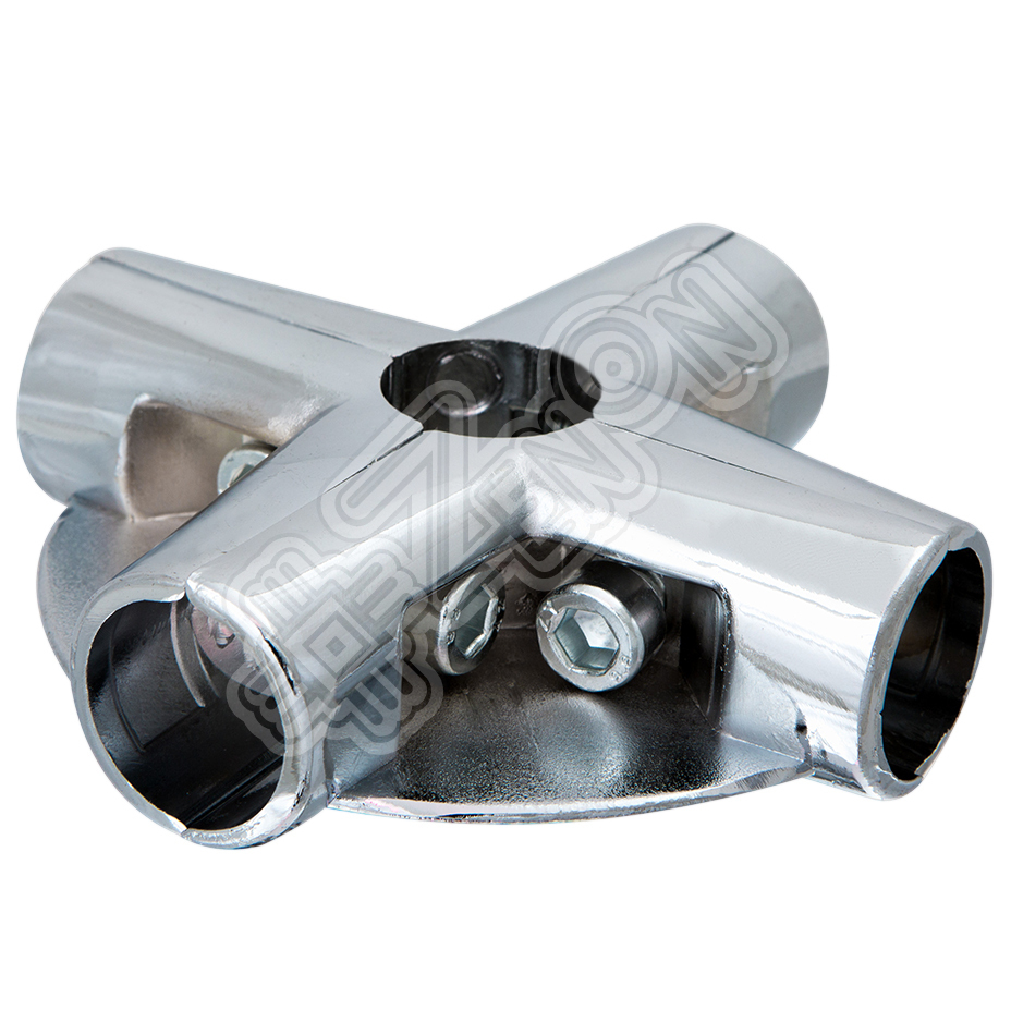 Соединитель труб в шести направлениях. Применяется для создания вертикальных объемных конструкций: для соединения стойки и 4-х труб под углом 90 градусов, имеет две подставки под полки. Вакуумное хромирование.