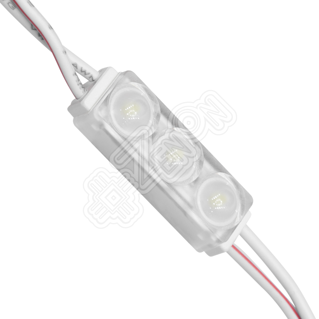 Главная особенность данных модулей - в первую очередь размер. Это самые маленькие модули с тремя светодиодами в нашем ассортименте. Благодаря этому появилась возможность засвечивать еще более миниатюрные элементы рекламы, будь то тончайшие изгибы шрифта вывески или отдельные небольшие детали. Однако, несмотря на уменьшенные габариты, световой поток модулей TIL составляет 70 лм. Также они выполнены в пластиковом корпусе со степенью защиты IP67, и потребляемая мощность составляет 0.72 W, что говорит о хорошей энергоэффективности. В то же время модули оснащены линзой с коэффициентом 1.6, что позволяет сэкономить на количестве данных модулей. К тому же в данной модели представлена возможность использования их в вывесках 30-40 мм глубиной. Идеально сочетаются с модулями серии TIL 1 SMD (арт. 11070). В данном модуле отсутствуют отверстия для монтажа, монтаж осуществляется на двусторонний скотч на тыльной стороне LED модуля. Как показывает практика, при использовании данных светотехнических элементов, вполне достаточно точки крепления модуля и точки крепления проводов.