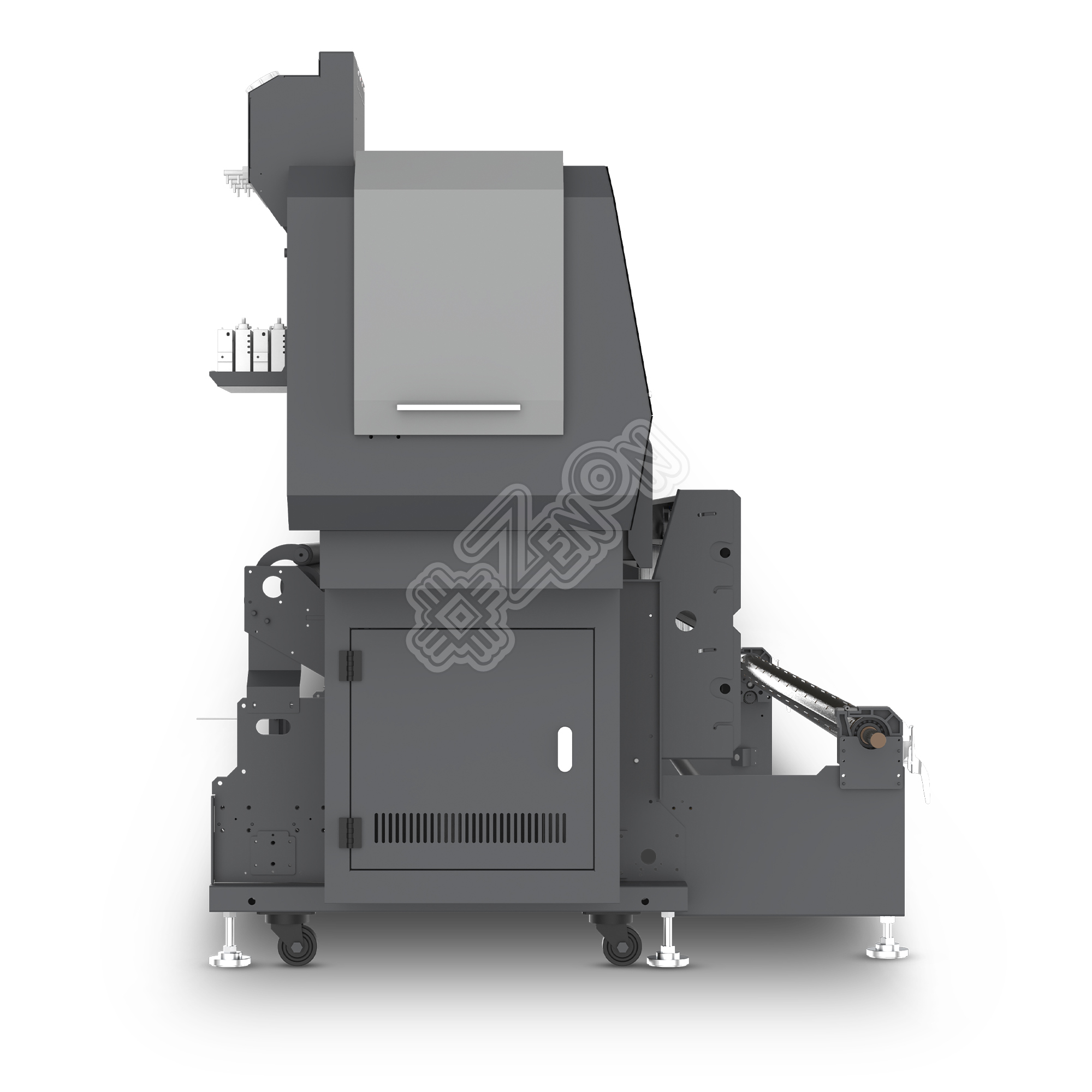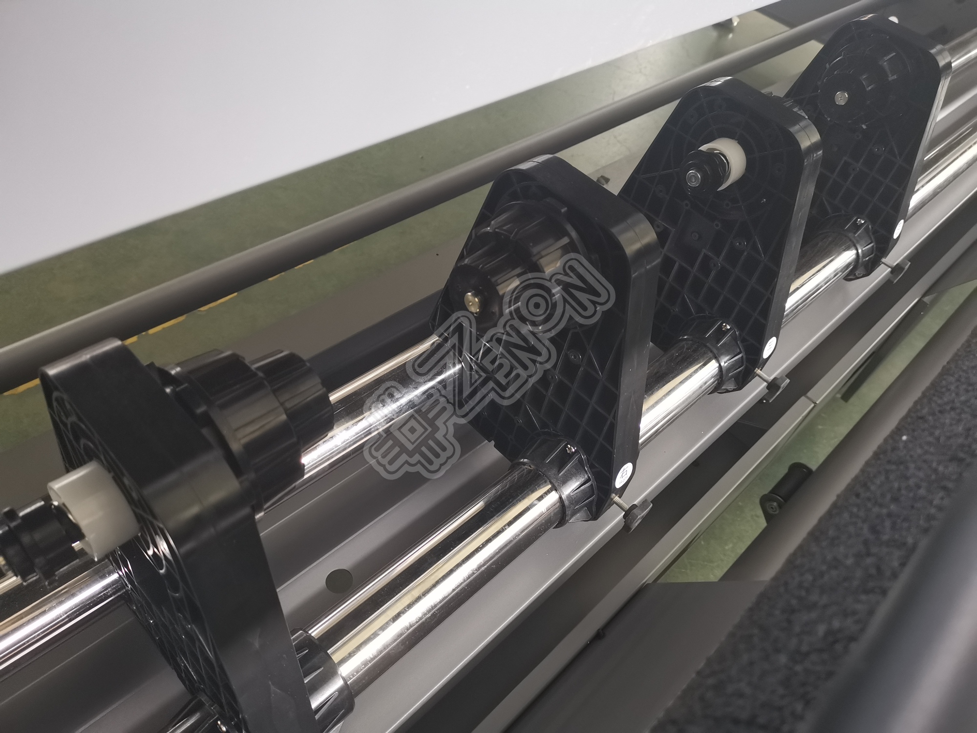 Активная, тройная система размотки с прорезиненным прижимным валом подачи позволяет работать с тяжелыми рулонами до 150 кг, печатать с двух рулонов одновременно, а также комфортно устанавливать разные материалы благодаря универсальному пневматическому валу размотки. Система подмотки материала не отстает по промышленному классу, она также укомплектована пневматическим валом с двигателем!
