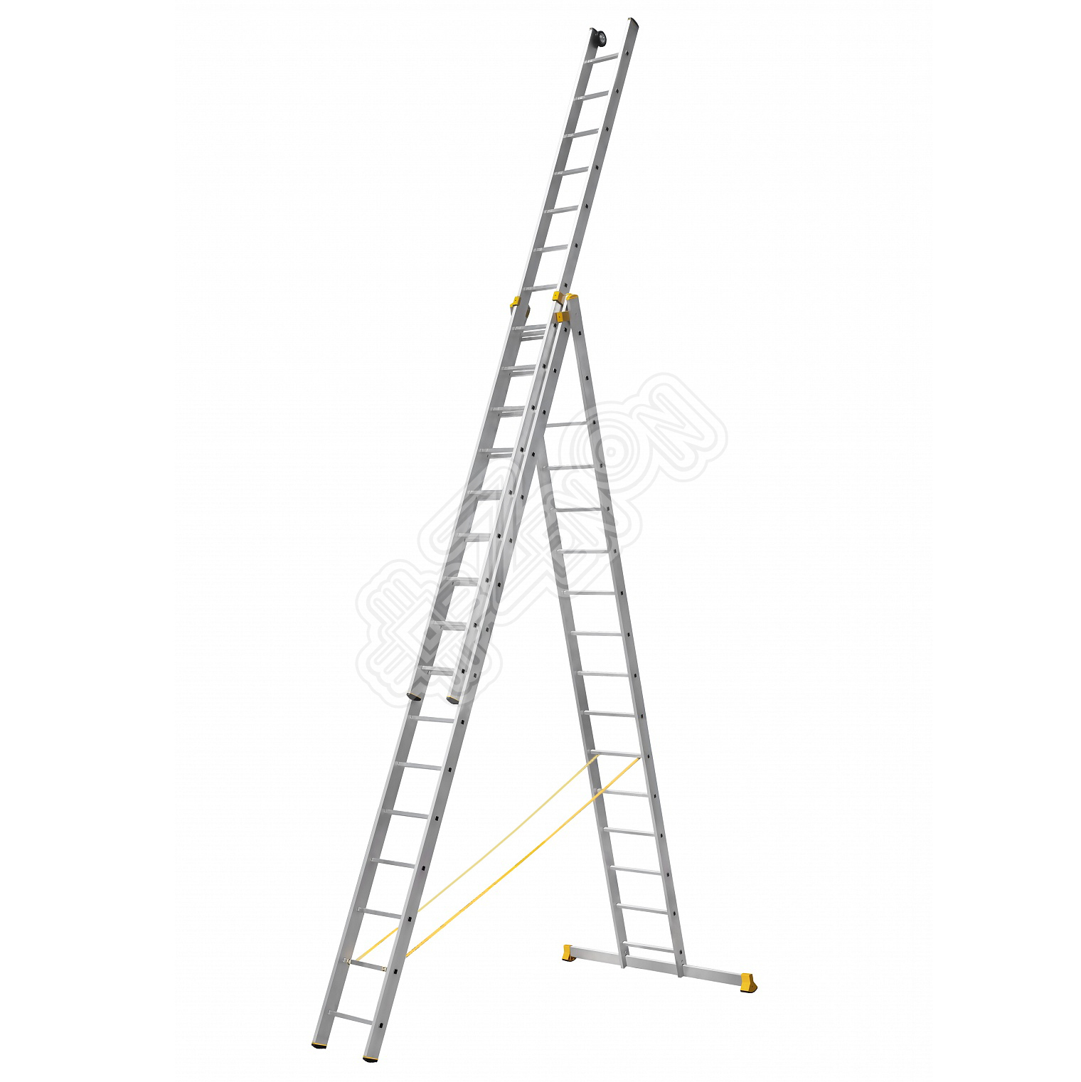 Алюминиевая профессиональная трехсекционная универсальная лестница, в отличии от обычной серии, имеет более прочный профиль, сечением 100 х 25 мм и существенно больший вес.