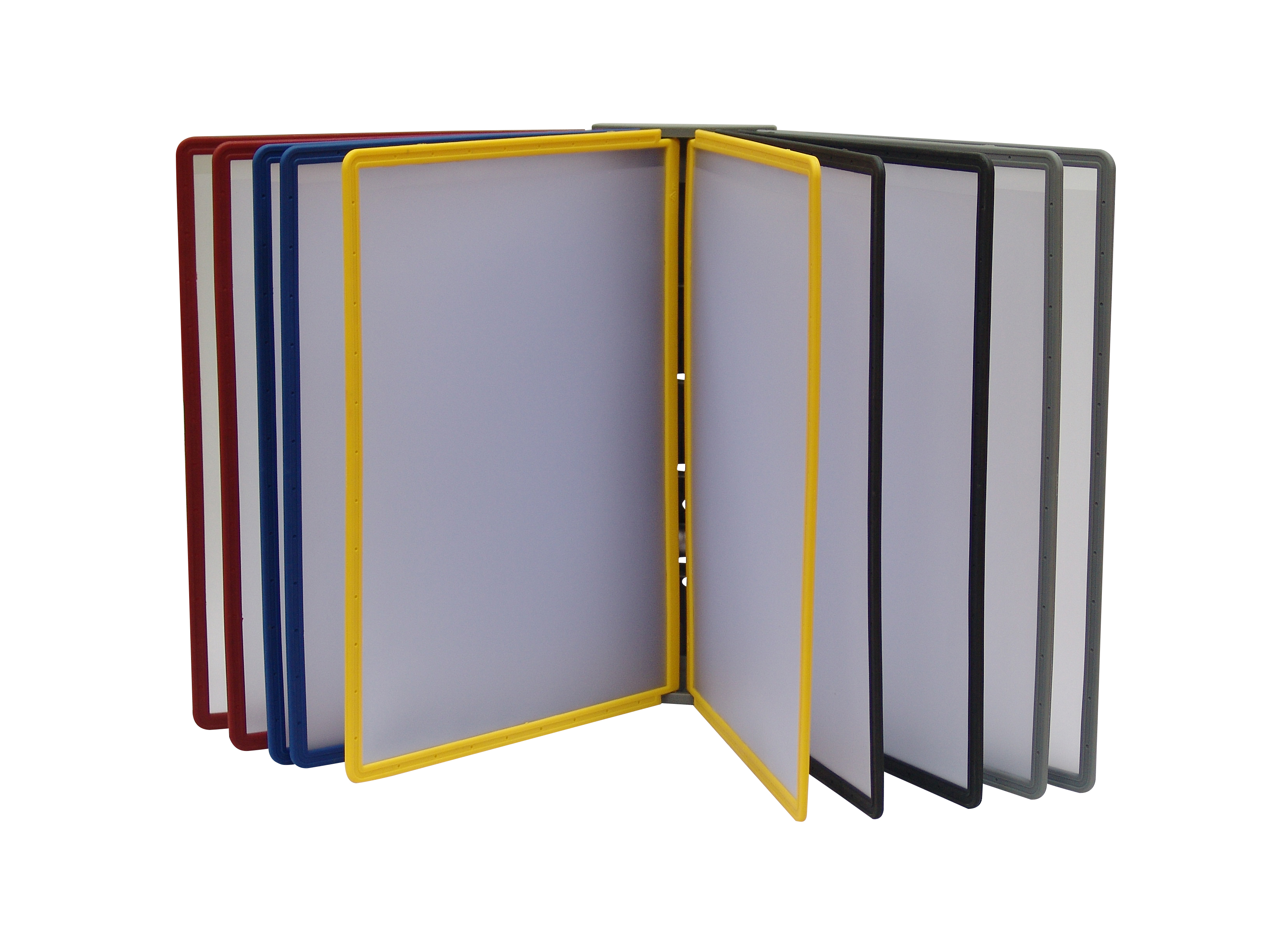 Перекидное устройство, предназначенное для крепежа на стену. 10 чёрных полипропиленовых рамок А4 в комплекте. Изготовлено из пластика.
