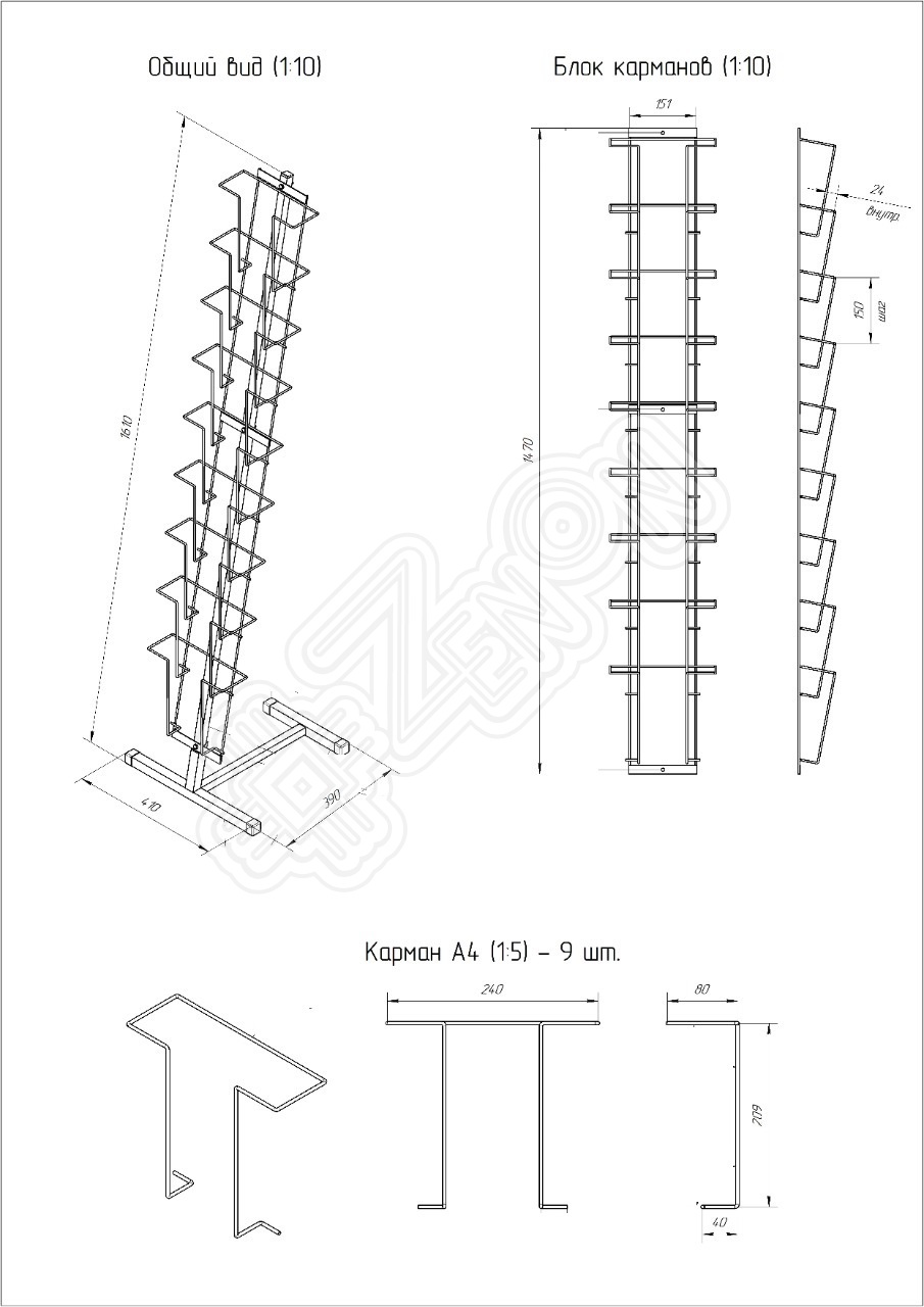 Представляет собой металлический разборный каркас на 9 карманов для печатной продукции. Угол наклона в 11 градусов обеспечивает легкий доступ и удобство в ознакомлении с представленной печатной продукцией. В карманах можно размещать любые печатные материалы формата А4: листовки, журналы, буклеты, папки, каталоги.