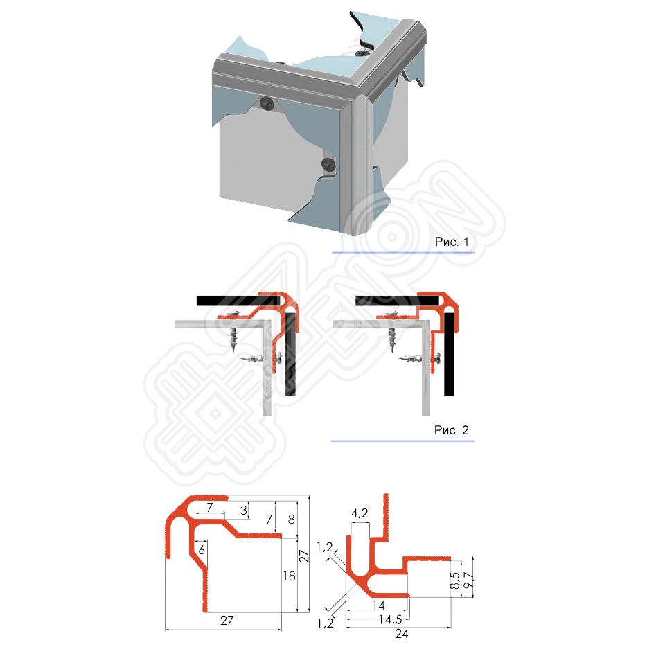 Профиль "V"-типа. Один из пяти профилей системы "ALU-FAST". Предназначен для угловой стыковки панелей (оформление внешнего угла) (рис. 1). Например, таких, как листы композитных панелей, акрила, ПВХ и других материалов. Особая форма ножки позволяет устанавливать крепежные элементы и обеспечить беспрепятственную установку панели в паз профиля (рис. 2).