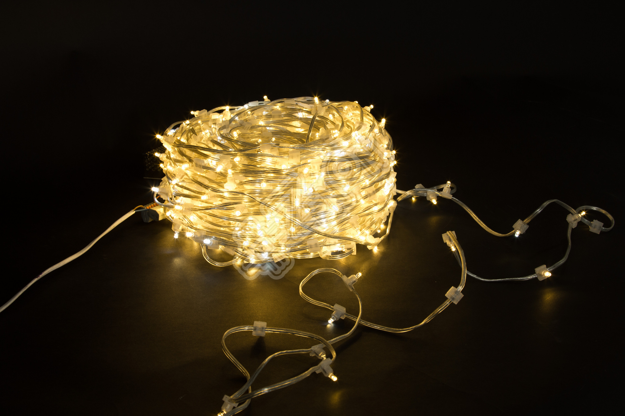 Основной провод. Обычно это провод на котором последовательно на расстоянии 15 или 30 мм расположены влагозащищенные лампы или светодиоды. Как правило, поставляется в бухтах по 100 м. Один конец провода подключается к источнику питания, другой нужно заизолировать.