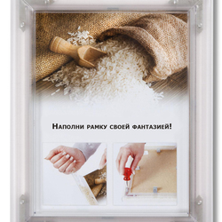 Профиль полый внутри, что позволяет использовать различные наполнители для дизайна и стилизации под свои нужды. Например: конфетти или зерна кофе, сигареты или мелкие гайки, металлическая стружка или опилки. Дизайнеры по достоинству оценят возможности данного изделия. Раскраивается профиль для фоторамок торцевой пилой, а собирается с помощью металлических уголков. Лицевая сторона, рекламный носитель и задник поджимаются к рамке с оборотной стороны специальными пружинами, которые так же выполняют роль подвесов. Наполнитель загружается в момент, когда рамка собрана на трех уголках, после чего вставляется последний замыкающий уголок, и винты на уголках затягиваются.