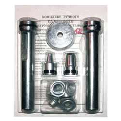 Для установки люверсов широкое распространение и даже популярность получил новый особый сборный ручной инструмент, состоящий из пробойника, небольшой наковальни и специального развальцовщика. На фото видно, что набор упакован в блистерную упаковку, картонная вкладка имеет инструкцию, простые иллюстрации. Практический смысл упаковки в том, чтобы избежать ударов, сколов, замятий, царапин и т. п.