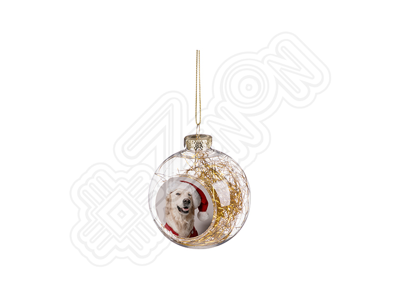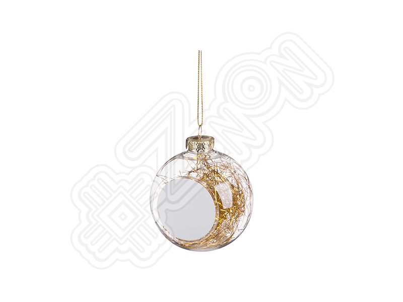 Елочный шар для сублимации d=80 мм, пластиковый, с алюминиевой вставкой d=50 мм, прозрачный с золотой мишурой