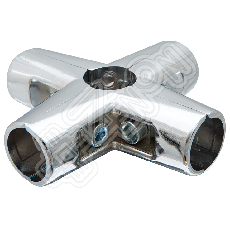 Соединитель труб в шести направлениях. Применяется для создания вертикальных объемных конструкций: для соединения стойки и 4-х труб под углом 90 градусов. Гальваническое хромирование.