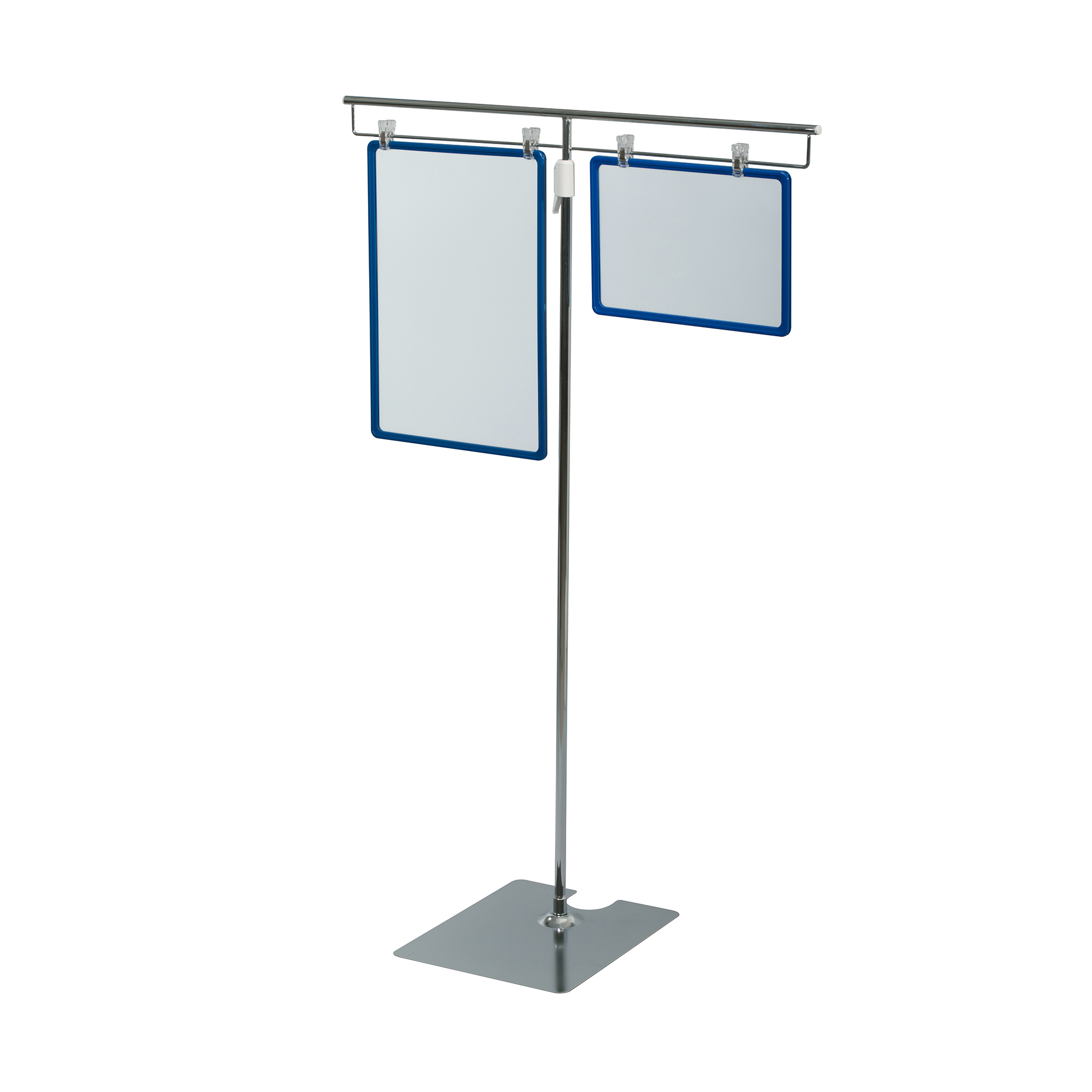 Телескопическая Т-образная стойка с металлическим основанием. Поставляется без рамки. Высота: 1150-2100 мм.