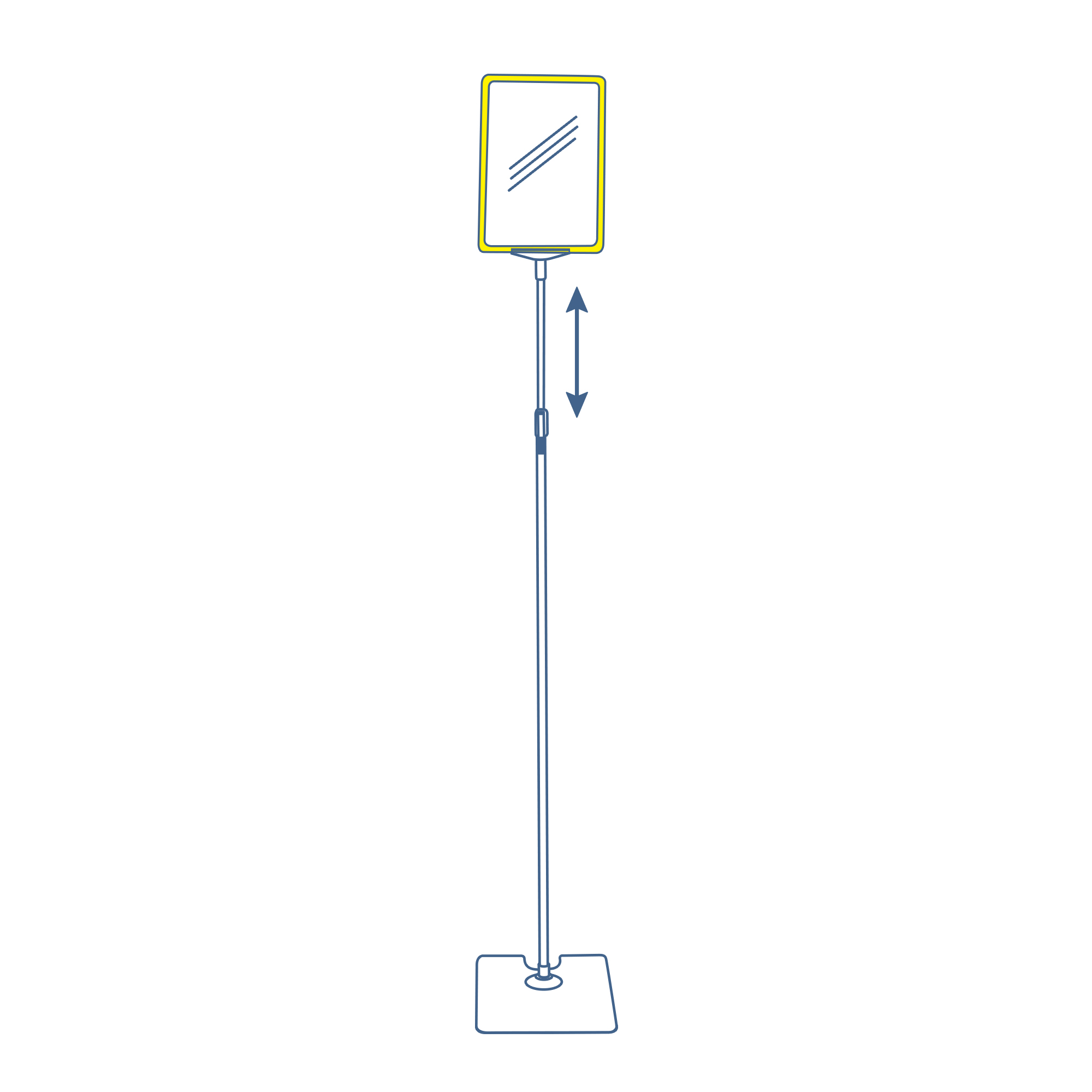 Телескопическая хромированная стойка с металлическим основанием. Поставляется в комплекте с рамкой формата А4 и пластиковым карманом. Высота: 1150-1700 мм. Цвет: жёлтый.