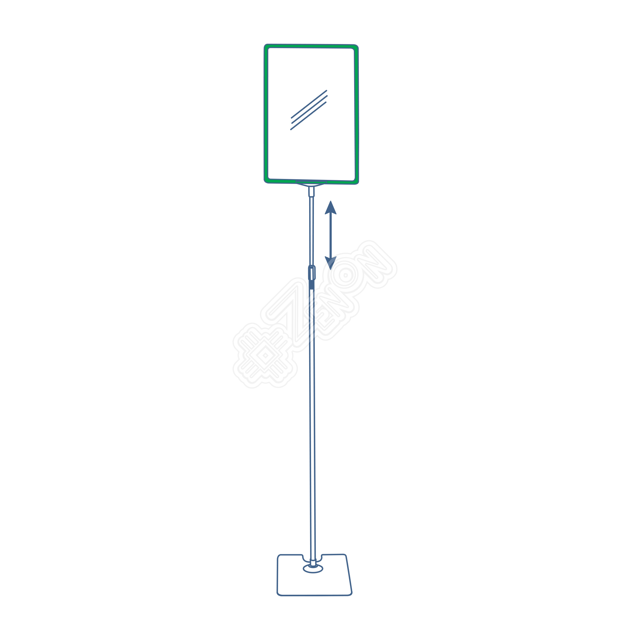 Телескопическая хромированная стойка с металлическим основанием. Материал трубки - алюминий. Поставляется в комплекте с рамкой формата А3 и пластиковым карманом. Высота: 1300-1900 мм. Цвет: зелёный.