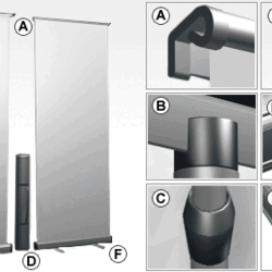Роллерный стенд, изготовлен из алюминия, с пластиковыми боковинами. Имеет внешнюю ручку подводки механизма пружины. Постер хранится в основании и растягивается по принципу "Экран вверх"