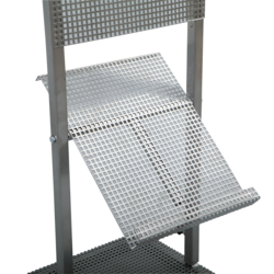 Буклетница выгнутого типа с полкой, раскладная, изготовлена из перфорированного листа, который служит основой для крепления навесных проволочных карманов различного формата. Размеры: 290 х 1505 мм. Цвет: серый металлик.