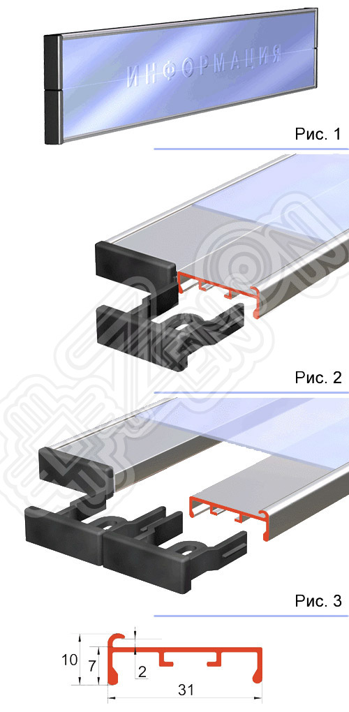 Слайд профиль - "S 31", является основой системы "ALU-MINI". Применяется во всех видах изделий (таблички, информационные модули и пр.) где предполагается использование сменных информационных табличек. Т. к. профиль имеет паз для фиксации таблички только с одной стороны, то формирование "кармана" в который она вставляется возможно при использовании второго слайд-профиля устанавливающегося в зеркальном положении (минимальная ширина вставляемой таблички 60 мм, рис. №1 и №2). Например, если необходимо закрепить табличку шириной 91 мм, то используются два обоюдно направленных слайд-профиля (рис. №3). Промежуток между профилями маскируется боковыми заглушками. Преимуществом данного способа изготовления табличек и информационных панно, в отличие от использования профилей заданной ширины (как это реализовано в конкурентных системах) заключается в том, что не нужно платить за скрытую от глаз часть алюминиевого профиля, что в конечном итоге существенно сказывается на стоимости конечного изделия. Это выгодно отличает систему профилей "ALU-MINI" от других систем.